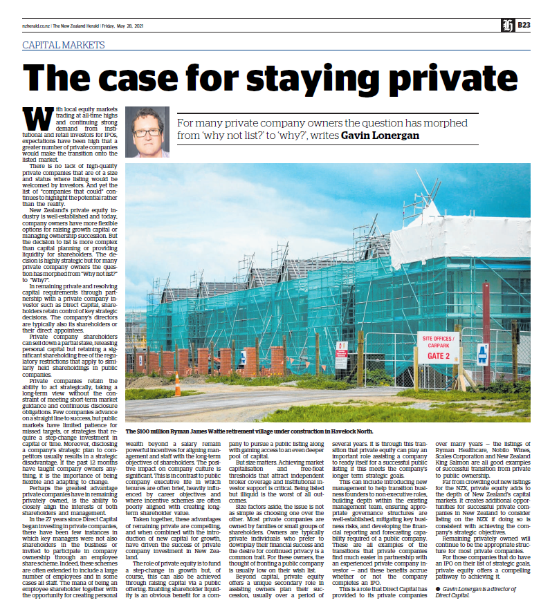 This is a role that Direct Capital has provided to its private companies over many years – the listings of Ryman Healthcare, Nobilo Wines, Scales Corporation and New Zealand King Salmon are all good examples of successful transition from private to public ownership.
